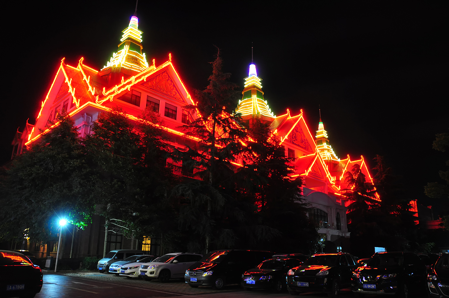 夜色降临,华灯初上,光影下的酒店洋溢着浓郁的异域风情。
