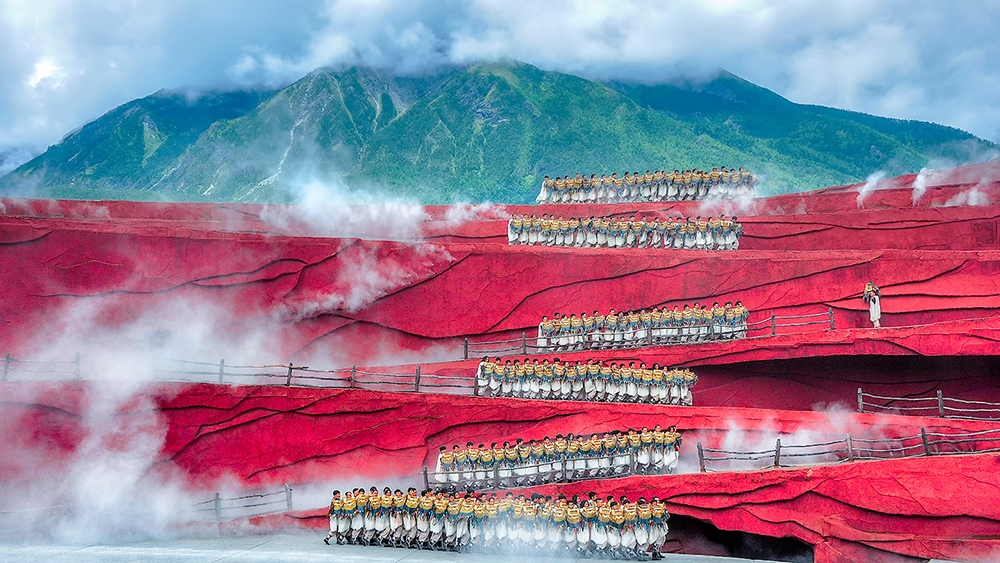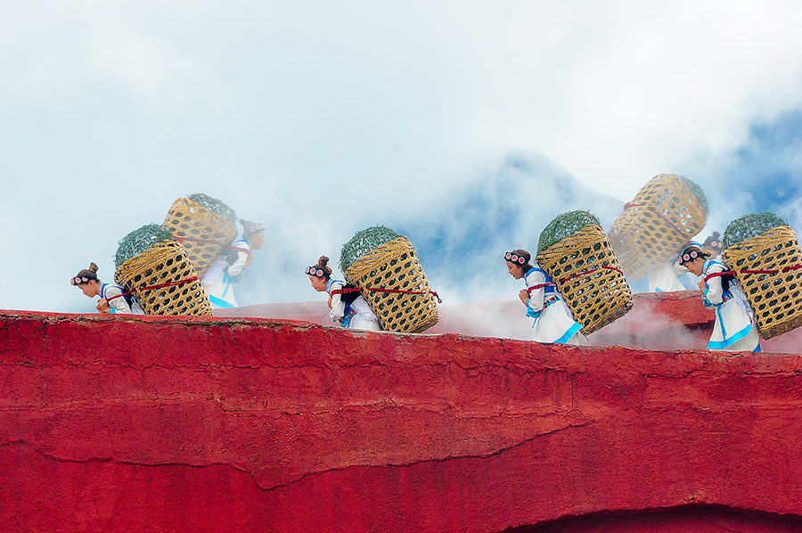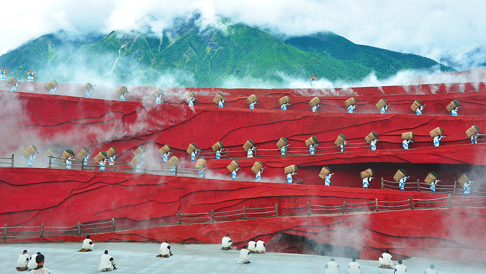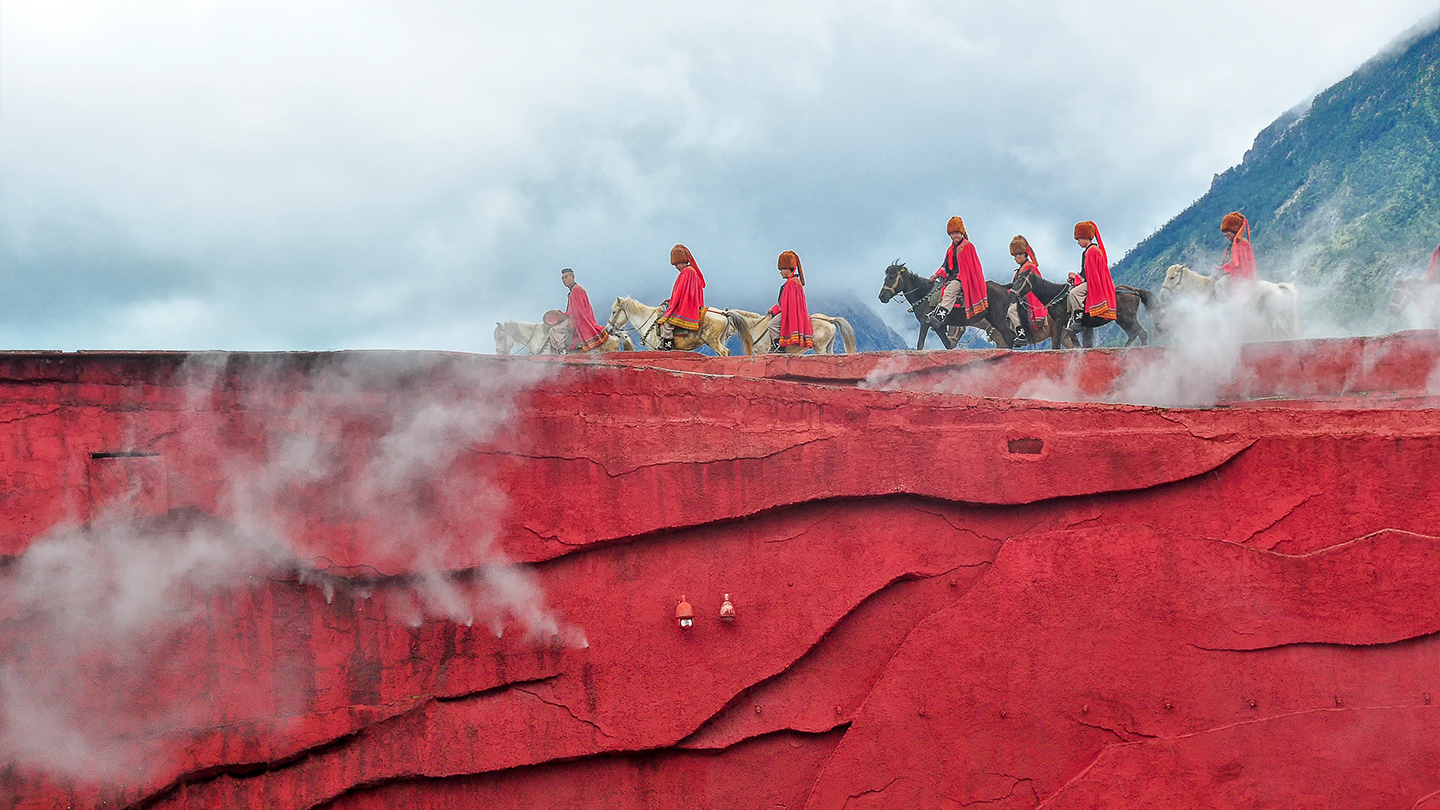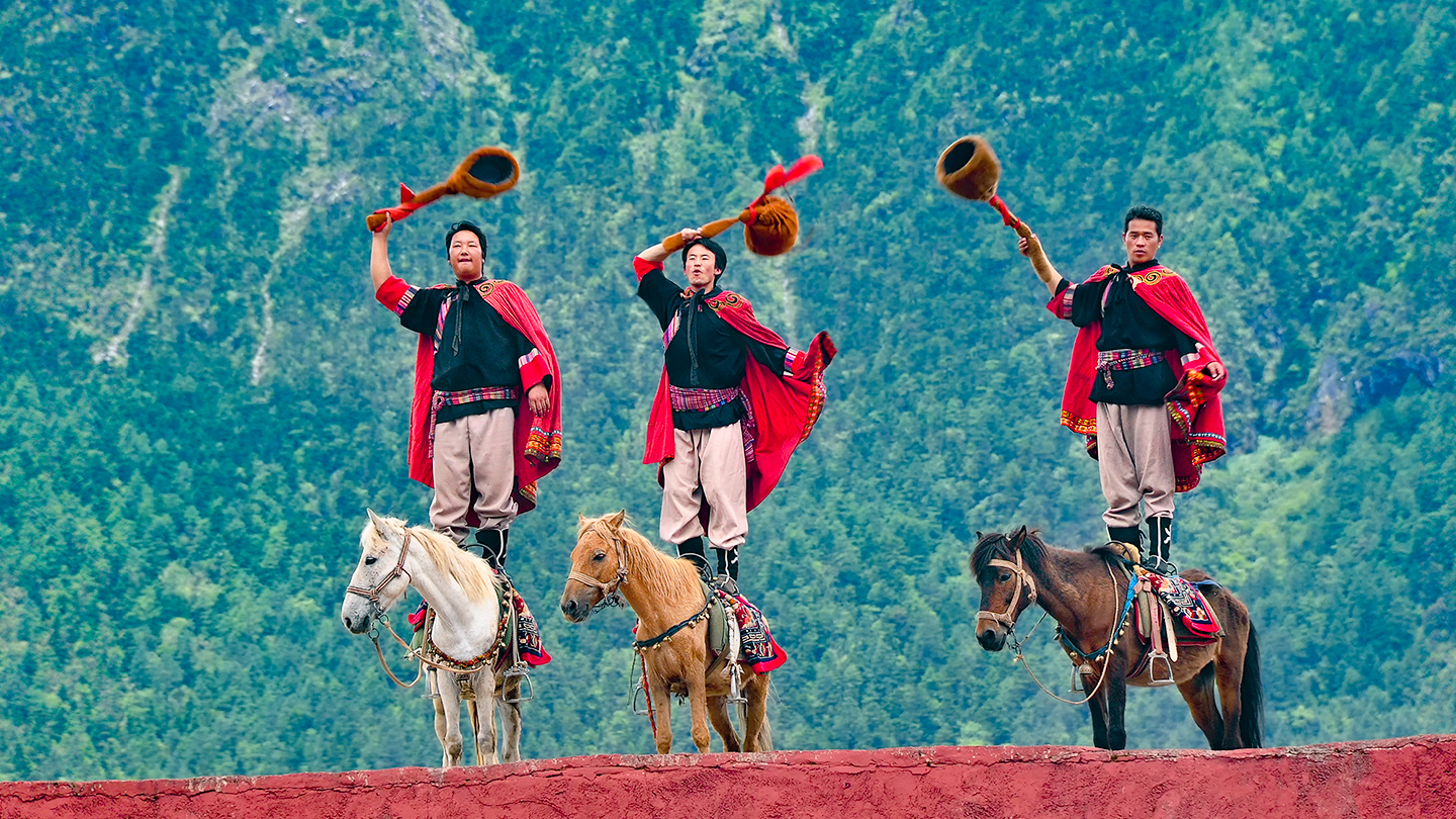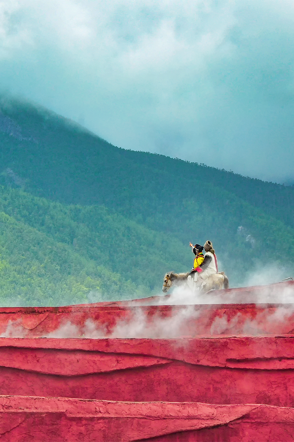 演员们纵马拾级而上,登顶后,继续结队绕场奔跑,仿佛是六百年前茶马古道上“山间铃响马帮来”的震撼再现。