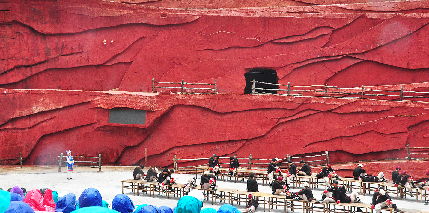 进入剧场里,半圆形的场地,很快就被热情的人群填满,水泥舞台尚空空如也,红色背景墙蜿蜒着之字形的多层阶梯,几个黑色的洞口透露着些许神秘, 唯有远处的雪山最是巍峨壮美。内心不禁产生疑问,这样平实的有些简单的舞台,既没有华丽的舞美,也没有炫目的灯光,将会有怎样的演绎呢,举世闻名的张艺谋导演如何打造【印象-丽江】盛宴呢? 平视静坐,待好戏开演.........