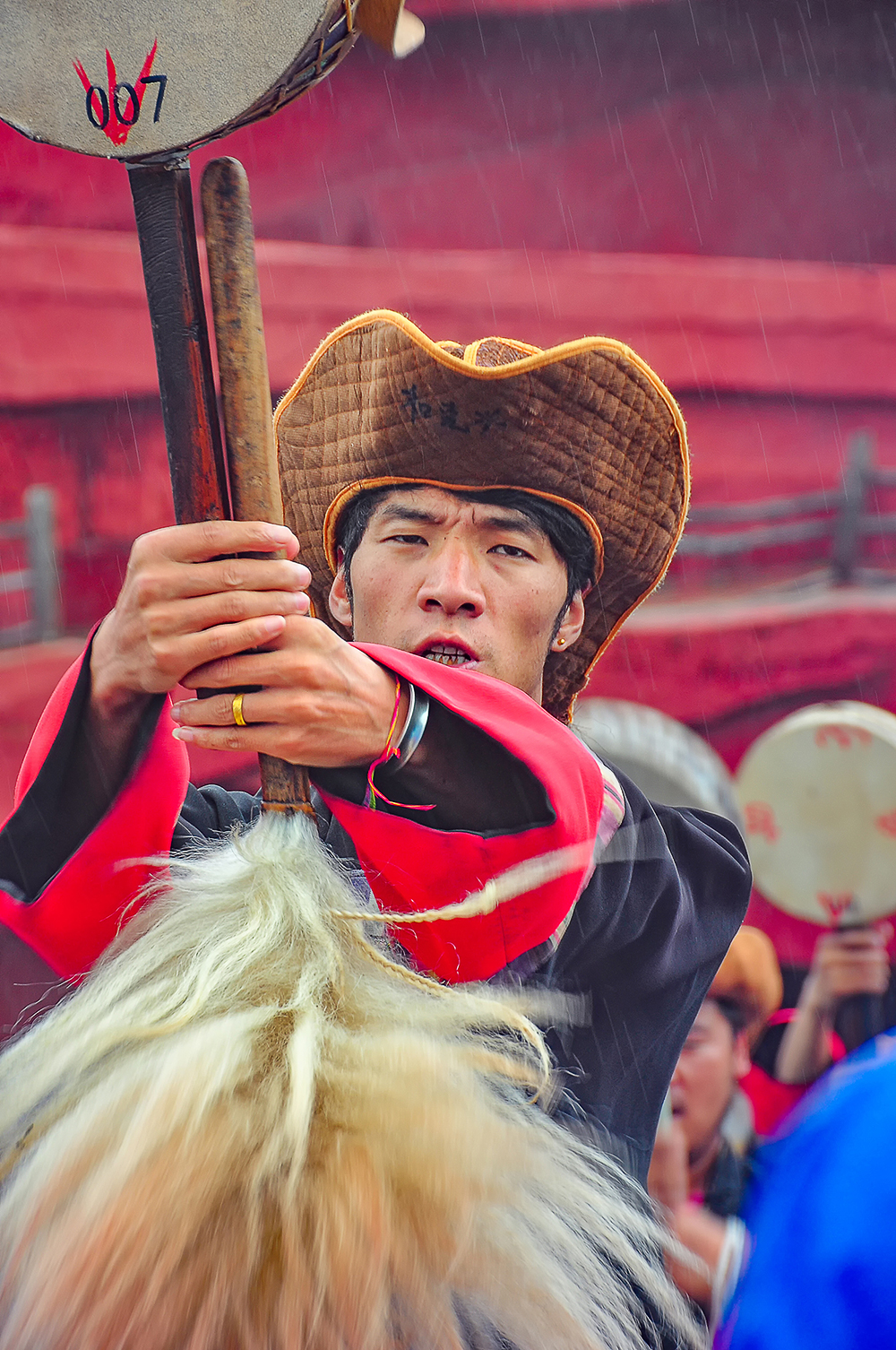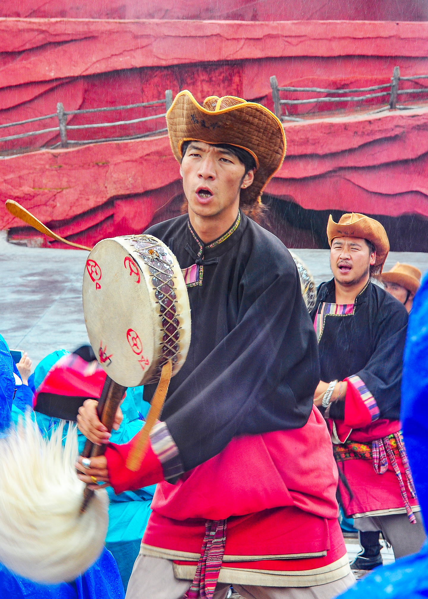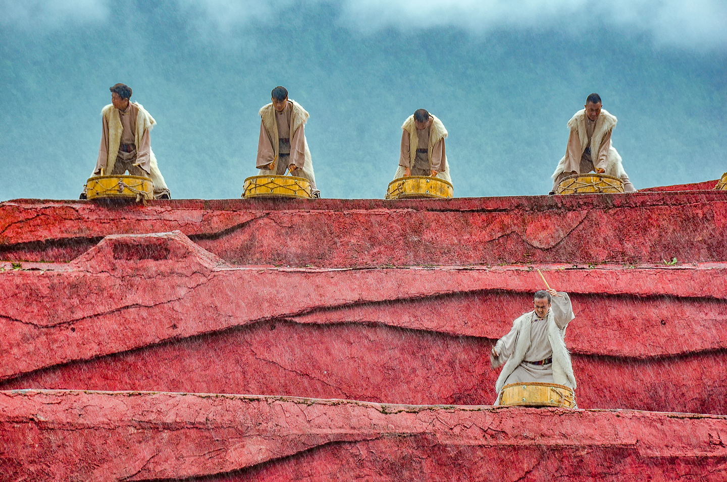 此刻,云,翻腾着席卷天空,已完全遮挡住了玉龙雪山,雨,由疏而密,只见红顶上那一行鼓者,巍峨不动,云卷云舒中击打出爆裂的鼓声~~ 雪山下豪迈的汉子们,舞动起来吧~