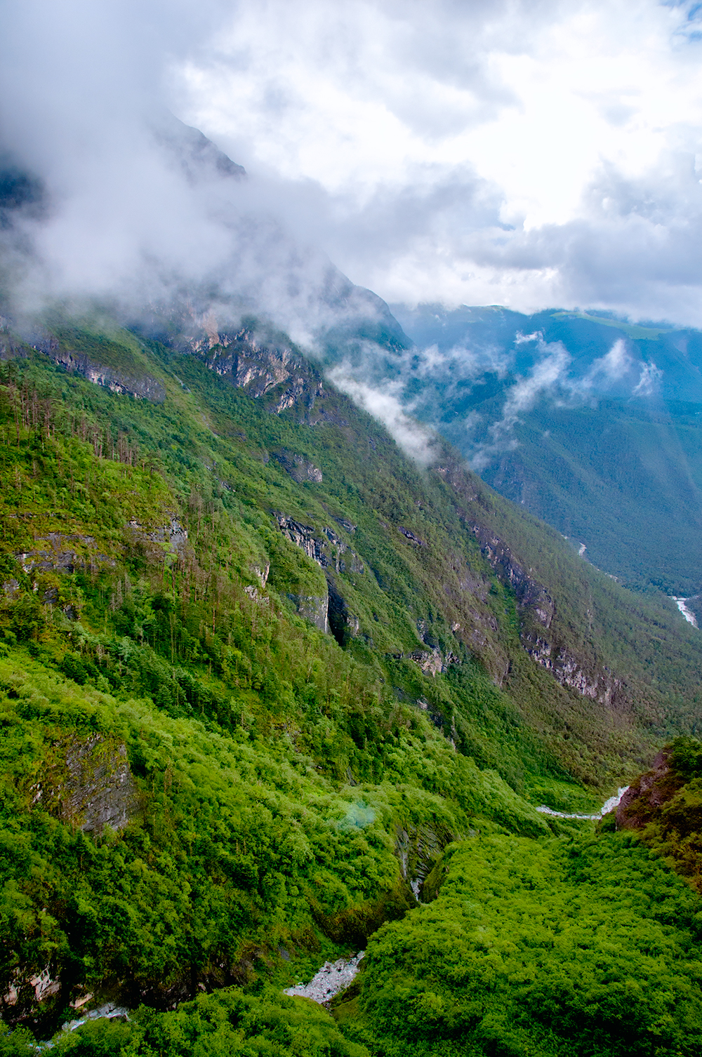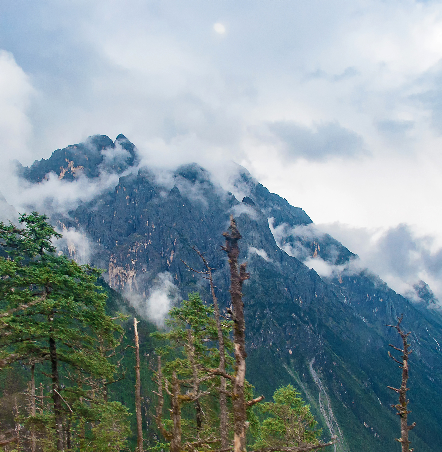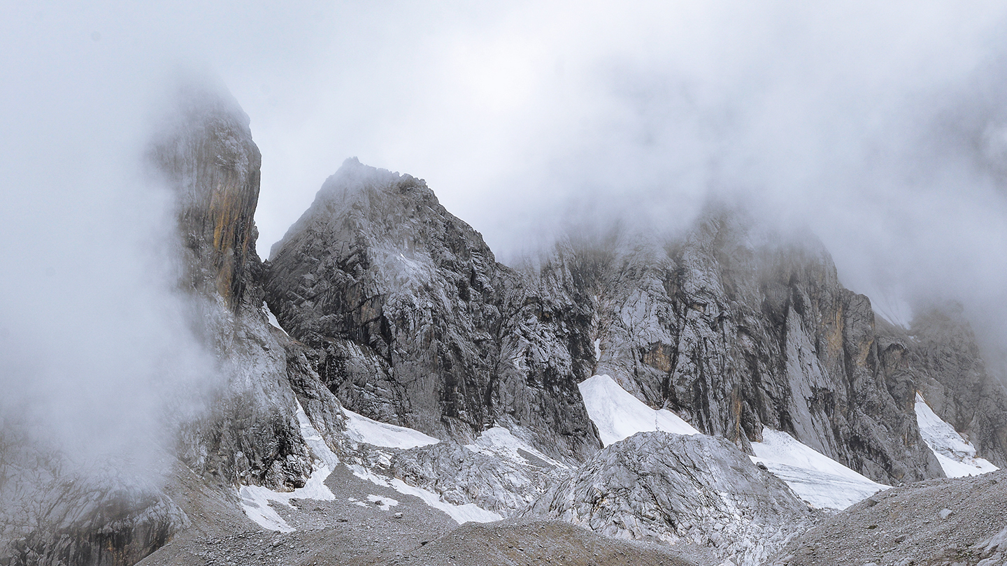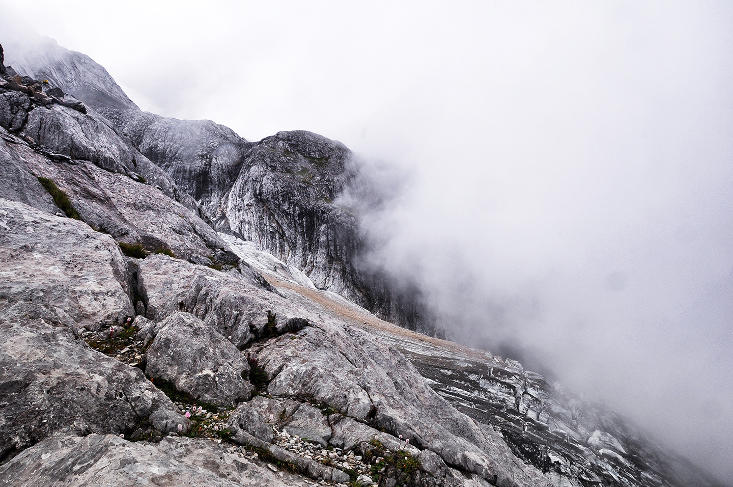 现在是7月,夏日玉龙雪山,在4000米高度是几乎看不到雪的痕迹,仰望高处寻觅,在山峰凹处,略有星点白色痕迹......所以如果你只爱银装素裹的玉龙雪山,就一定要选好季节哦~ 不过,美人千面,褪去白色衣衫的玉龙雪山,更显出一种饱经沧桑的力量感,令人不由的对大自然心生敬畏之心。 那黑石、灰岩、白色的雾气,恰似一副天然无雕琢的水墨画跃然纸上~ 美一直在那里,只是缺少发现......[LY:0130][LY:0133]