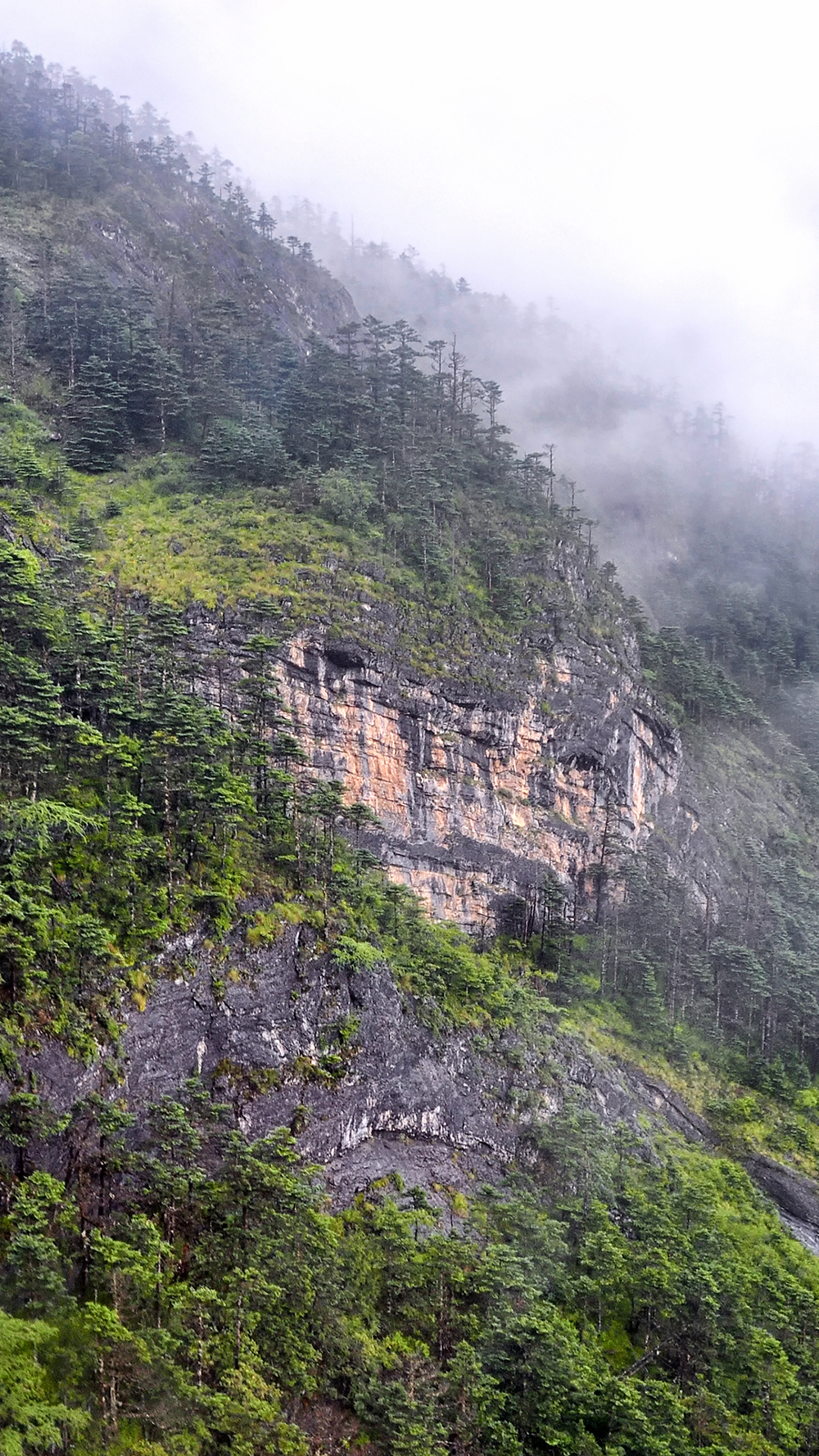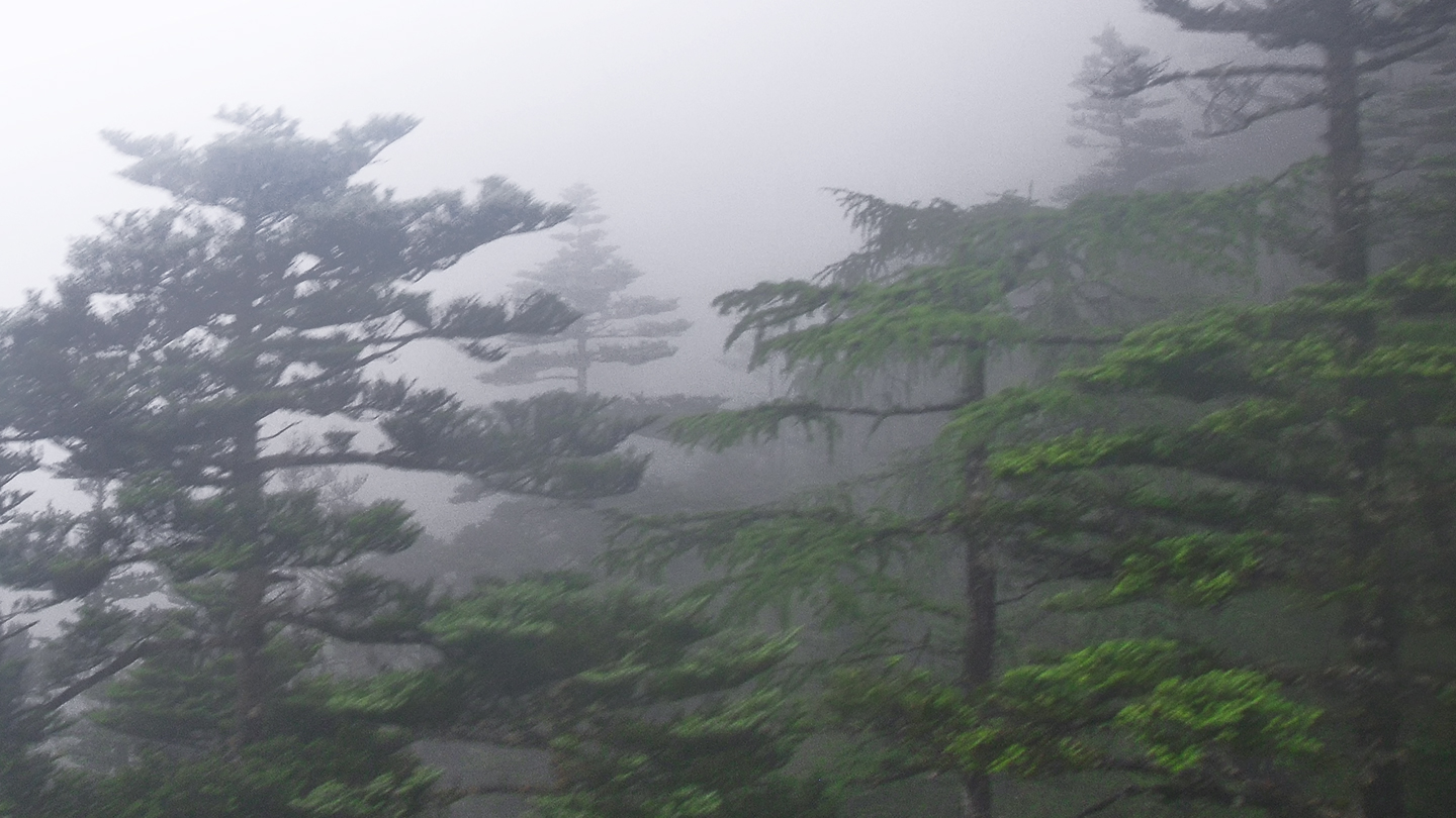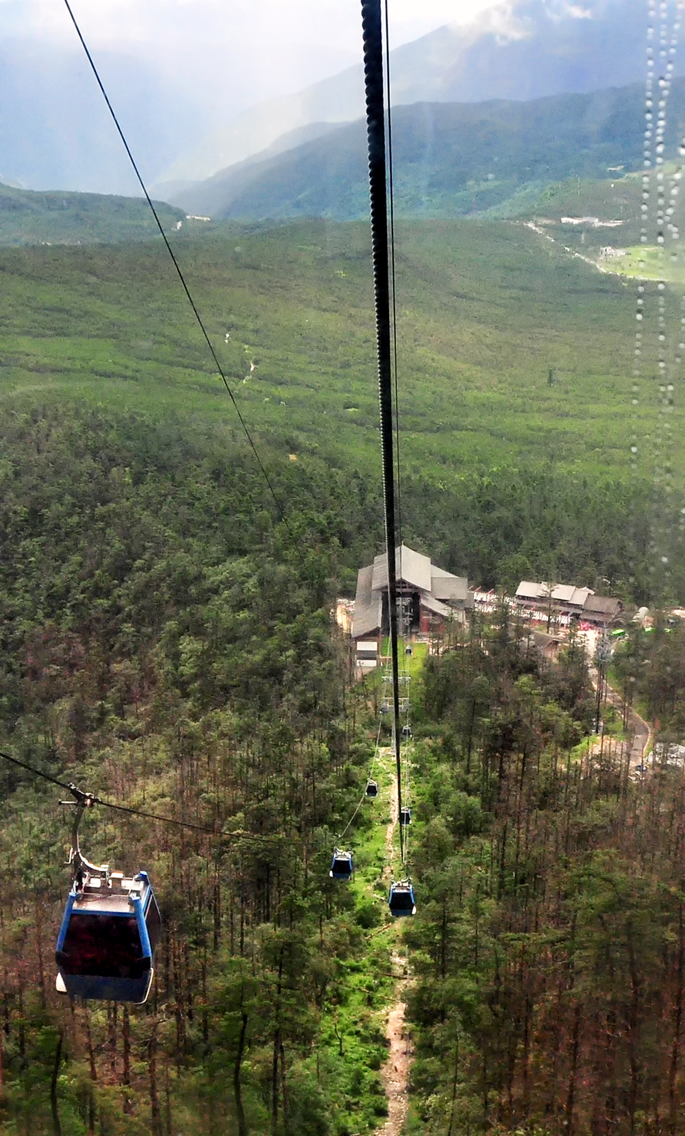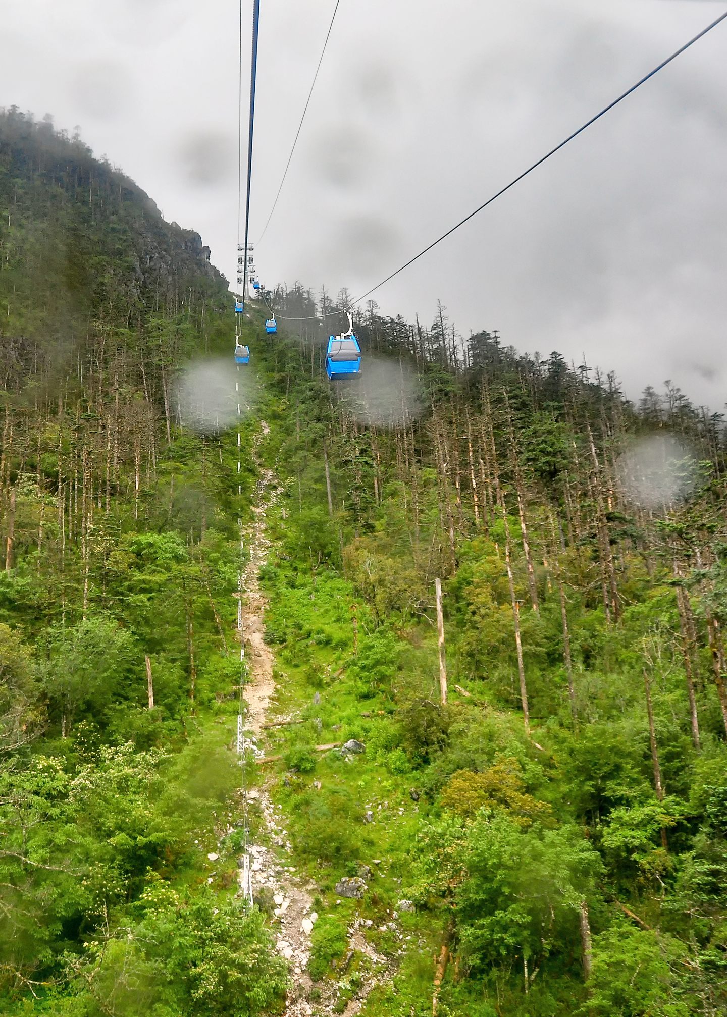 大索道的观光箱可乘坐8人,对向坐两排,上半部分是玻璃,可环视观赏山坡上葱茏的草木。 只是天公不作美,持续阴雨,没有一点晴天的意思,高处的山峰更是害羞的隐藏在云后,不肯出来见人~ 缆车上升很快,爬升后能见度持续降低,再瞭望四方已皆是朦胧之色、满眼云雾缭绕,只可见近旁的高山松向后快速略过 ...... 暗想到达山顶会是什么样子呢?