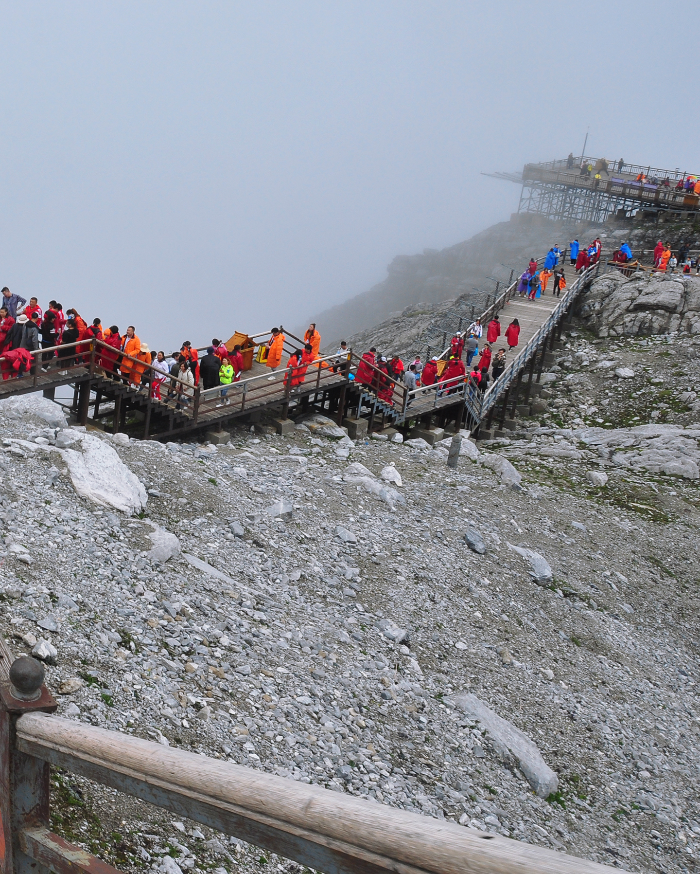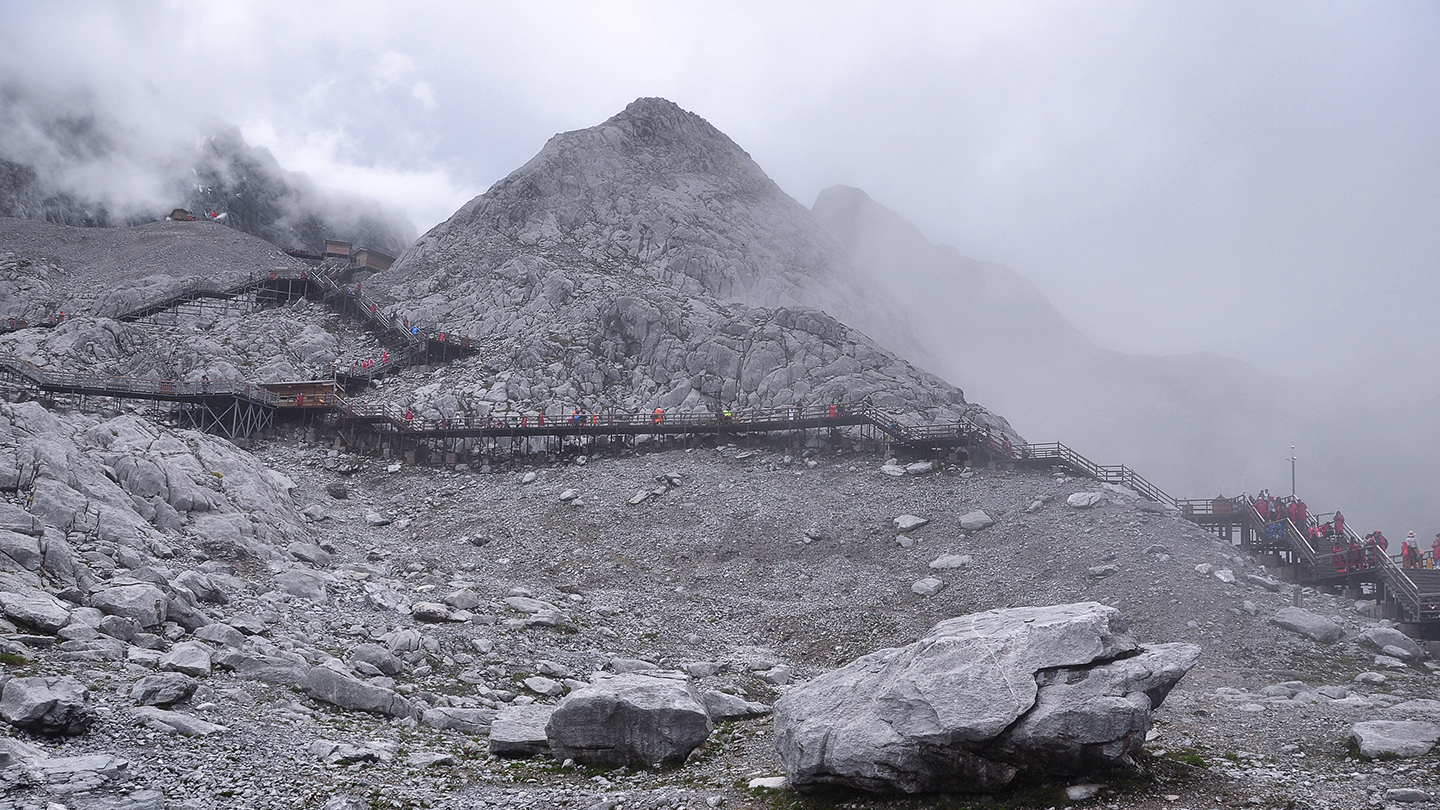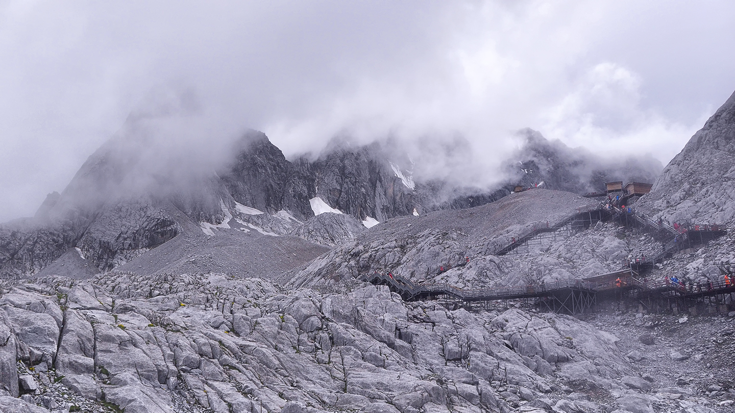 相比等待的时间,缆车简直是以迅雷不及掩耳盗铃之势,到达了4506米的冰川公园 。—— 说心里话,曾经的期待和想象,是险峻锋利的山峰刺破蔚蓝纯净的天空、覆盖着如银的皑皑白雪,阳光下反射出耀眼的光芒~~哈哈,快别让思想飞扬了,7月的阴雨天的玉龙雪山是这样的......