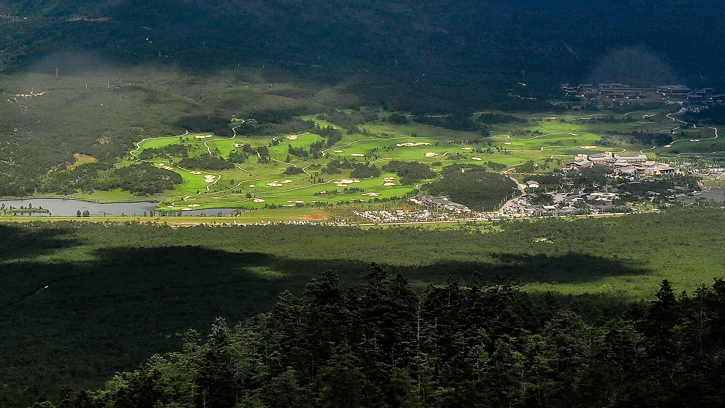 将行至索道尽头,有阳光从云隙撒下来,照在玉龙雪山下的高尔夫球场上。 这是亚洲唯一的雪山球场。球场坐落在玉龙3100米海拔的甘海子,由著名的球场设计师尼尔哈沃斯(NEIL HAWORTH)设计。因海拔较高,空气稀薄,地心吸力小而特别设计的十八洞72杆8415码的球道长度已被吉尼斯世界纪录官方证实为一项世界记录。