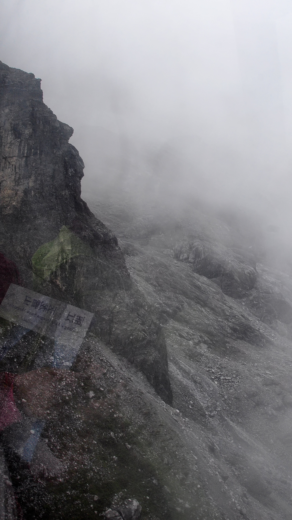随索道升降,可以明显感觉到山上植被的变化,从低海拔的林海,郁郁葱葱,到高海拔的岩石裸露 ,一片萧条......此时窗外一片荒芜,犹如科幻片里的未知星球~[LY:0104]。 轿厢玻璃上映出的影子,就是雪山留念照片的折页。[LY:0133]