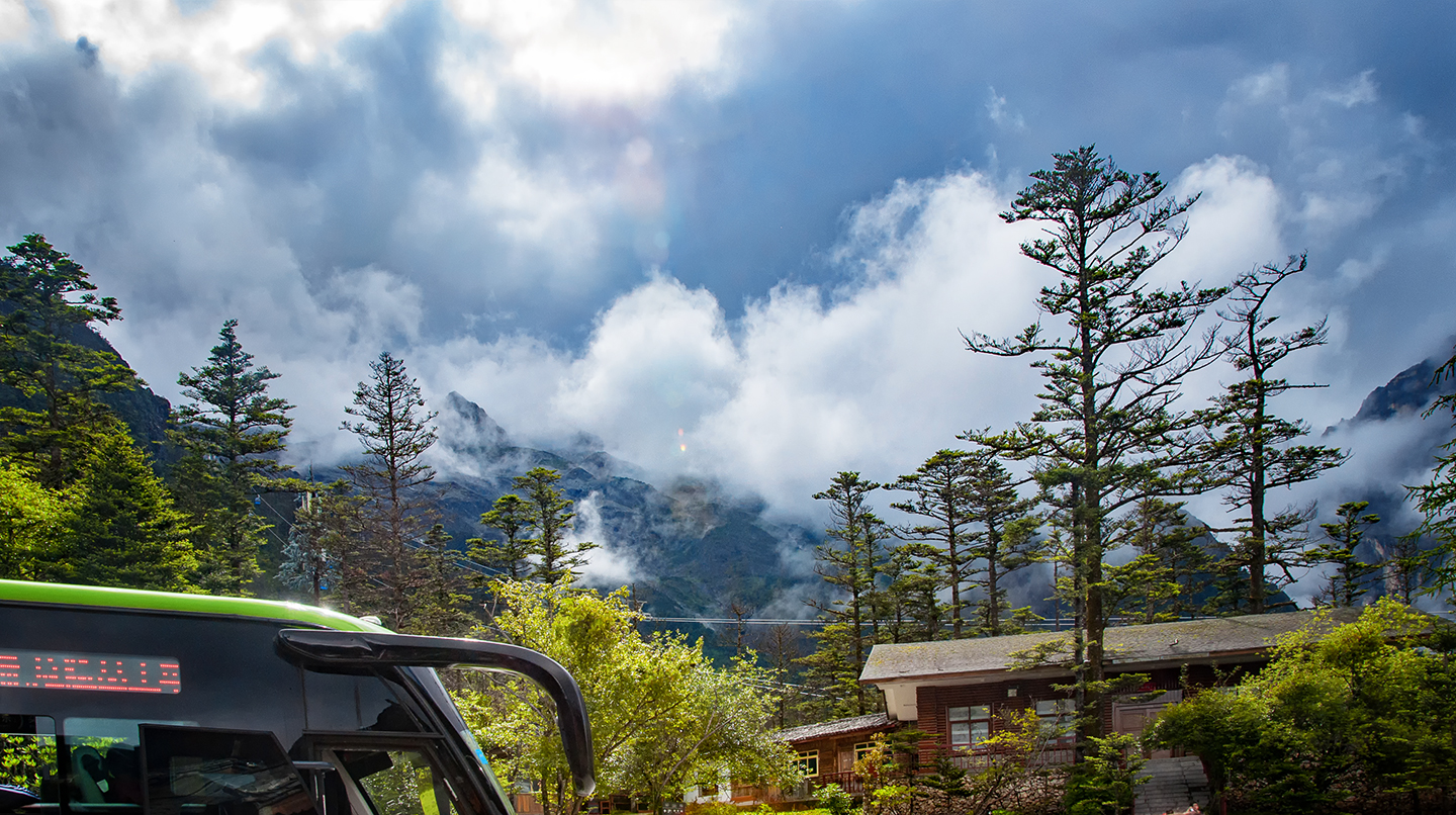 出索道后乘摆渡车下山,再次仰望玉龙山峰,阴云散去换做白云飘摇,不免心生丝丝遗憾,若能在山上等来此刻,应该可以欣赏到雪山更迷人的风采~。 不过,凡事皆两面,不圆满也是一种美好~~ 或许,这次的不完美将成为再次邂逅的理由吧~。